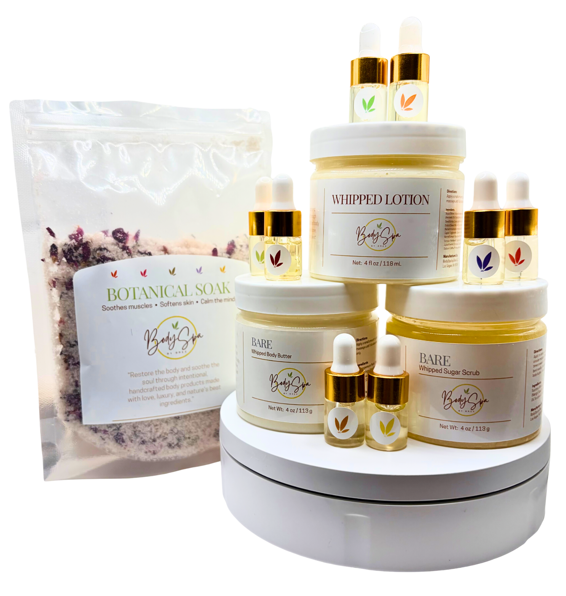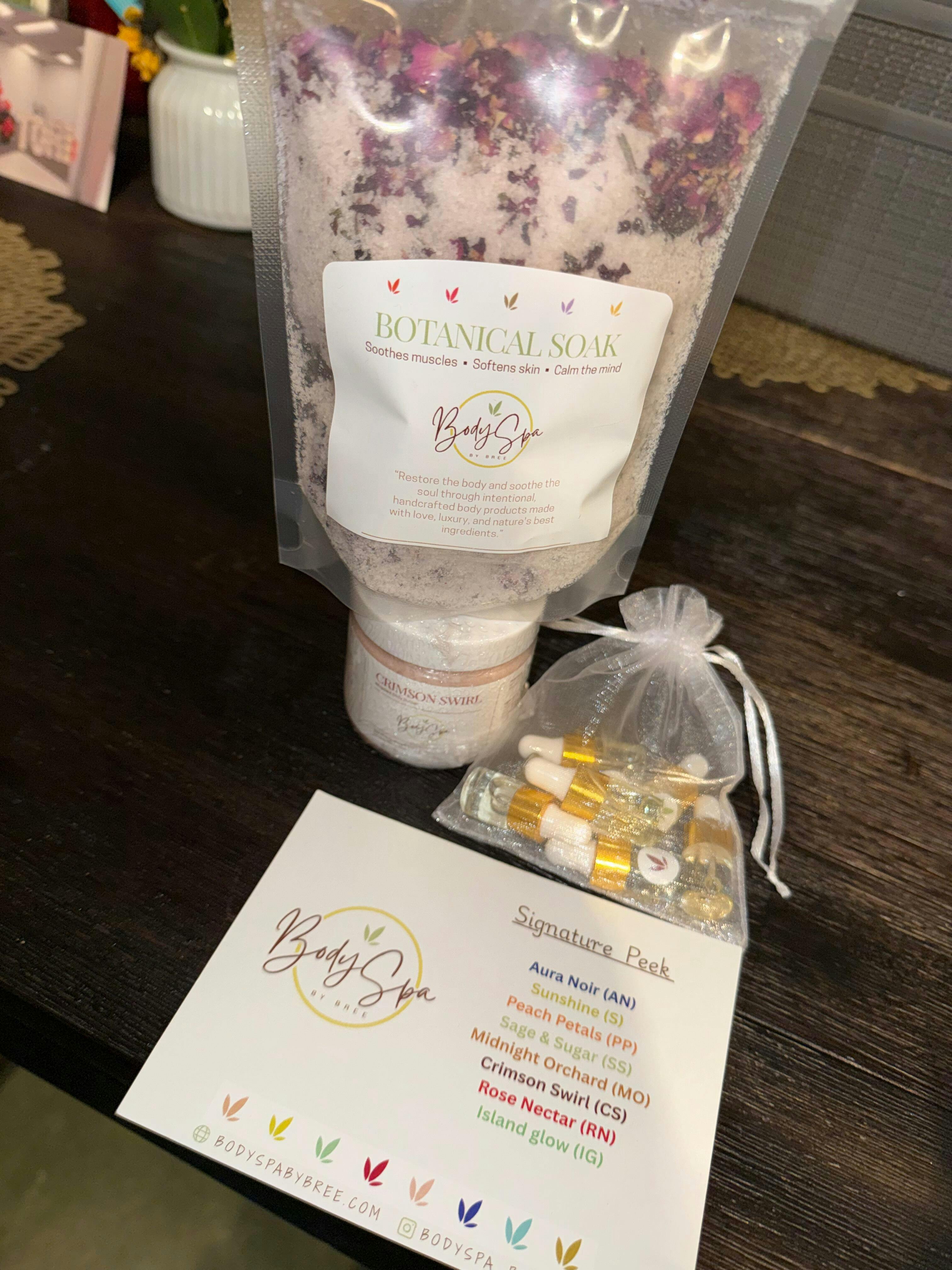 Indulge in the ultimate at-home spa experience with our 4 oz Self-Care Starter Kit. This curated collection includes a nourishing body scrub, whipped body butter, hydrating lotion, soothing bath soak and a mini sample to explore even more of our signature treats/scents. Each product is crafted with skin-loving ingredients to exfoliate, moisturize, and restore your glow—turning your self-care moments into a true BodySpa by Bree ritual. Perfect for gifting or treating yourself to a complete wellness experience.